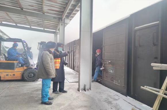 榆樹(shù)屯車站工作人員指導(dǎo)成品庫(kù)火運(yùn)裝車